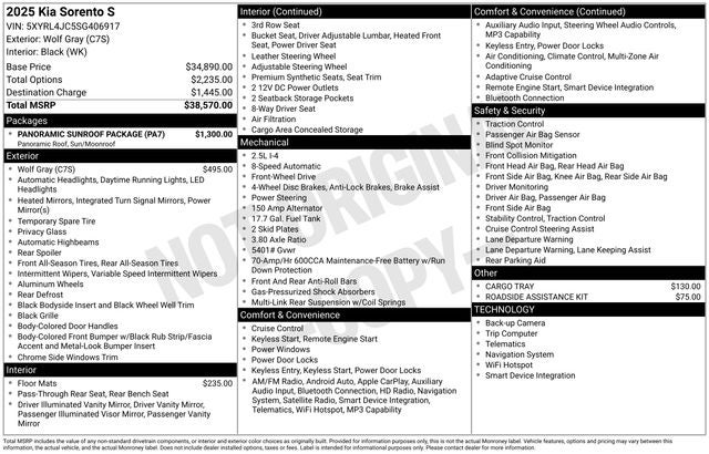 The Sorento S boasts a striking Gray exterior, complemented by a spacious and well-appointed interior. With its efficient 2.5L I4 engine and impressive fuel economy of 23 city/31 highway MPG, this SUV delivers the perfect balance of power and efficiency.