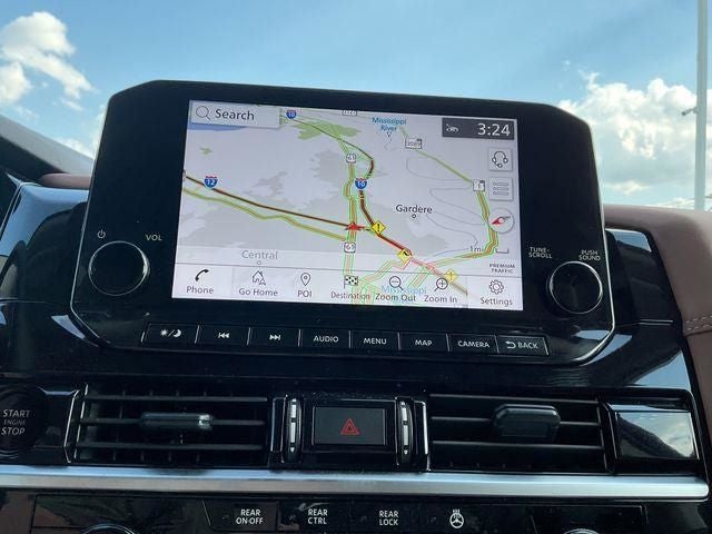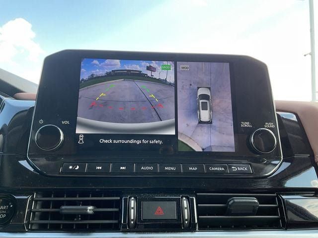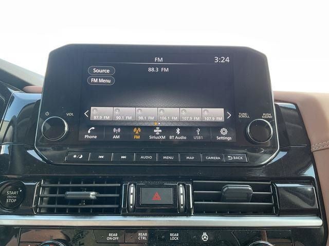 13 Speakers, 3rd row seats: bench, 4-Wheel Disc Brakes, ABS brakes, Air Conditioning, Alloy wheels, AM/FM radio: SiriusXM, Auto High-beam Headlights, Auto tilt-away steering wheel, Auto-dimming Rear-View mirror, Automatic temperature control, Bench Seat Carpeted Floor Mats (set of 4), Black Splash Guards (set of 4), Bodyside moldings, Bose Premium Audio System, Brake assist, Bumpers: body-color, Cargo Area Protector, Cargo Net, Cargo Package, Climate Controlled Front Bucket Seats, Cross Bars, Delay-off headlights, Driver door bin, Driver vanity mirror, Dual front impact airbags, Dual front side impact airbags, Electronic Stability Control, Emergency communication system, Exterior Parking Camera Rear, First Aid, Four wheel independent suspension, Front anti-roll bar, Front Bucket Seats, Front Center Armrest, Front dual zone A/C, Front reading lights, Fully automatic headlights, Garage door transmitter: HomeLink, HEADS-UP DISPLAY, Heated door mirrors, HEATED FRONT SEATS, Heated rear seats, Heated steering wheel, Illuminated entry, Knee airbag, Leather steering wheel, Low tire pressure warning, Memory seat, Navigation system: NissanConnect with Navigation and Services, NissanConnect featuring Apple CarPlay and Android Auto, NissanConnect with Navigation and Services, Occupant sensing airbag, Outside temperature display, Overhead airbag, Overhead console, Panic alarm, Passenger door bin, Passenger vanity mirror, Power door mirrors, Power driver seat, Power Liftgate, Power moonroof, Power passenger seat, Power steering, Power windows, Radio data system, Radio: AM/FM Audio System, Rain sensing wipers, Rear air conditioning, Rear anti-roll bar, Rear reading lights, Rear seat center armrest, Rear side impact airbag, Rear window defroster, Rear window wiper, Reclining 3rd row seat, Remote keyless entry, Security system, Semi-Aniline Leather-Appointed Seating Surfaces, Speed control, Speed-sensing steering, Speed-Sensitive Wipers, Split folding rear seat, Spoiler, Steering wheel memory, Steering wheel mounted audio controls, Tachometer, Telescoping steering wheel, Tilt steering wheel, Traction control, Trip computer, Turn signal indicator mirrors, Variably intermittent wipers, Ventilated front seats, Wheels: 20 x 8J Machined Alloy.