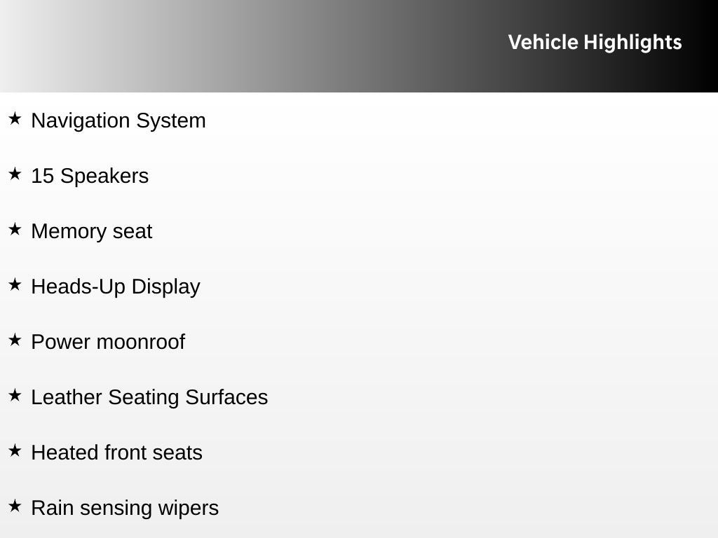 15 Speakers, Heads-Up Display, Heated front seats, Leather Seating Surfaces, Memory seat, Navigation System, Power moonroof, Rain sensing wipers.