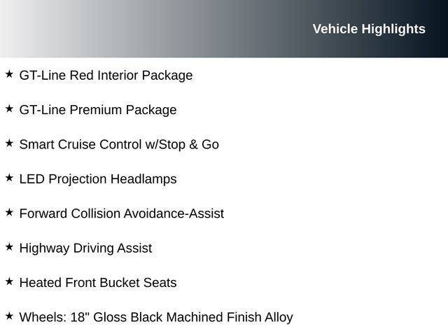 - GT-Line Premium Package with Smart Cruise Control, LED Projection Headlamps, Highway Driving Assist, and Forward Collision Avoidance-Assist