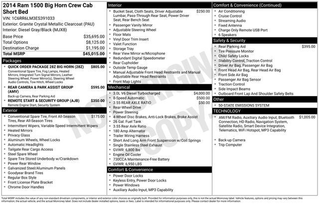 Granite Crystal Metallic Clearcoat 2014 Ram 1500 Big Horn RWD 8-Speed Automatic EcoDiesel 3.0L V6 WE DELIVER ANYWHERE, Bighorn Badge, Bright/Bright Billets Grille, Class IV Receiver Hitch, Fog Lamps, Leather Wrapped Steering Wheel, ParkSense Front/Rear Park Assist System, ParkView Rear Back-Up Camera, Power Black Trailer Tow Mirrors, Premium Cloth 40/20/40 Bench Seat, Quick Order Package 28Z Big Horn, Rear Camera & Park Assist Group, Remote Start & Security Group, Remote Start System, Security Alarm, Steering Wheel Mounted Audio Controls, Wheels: 20 x 8 Aluminum Chrome Clad, 1 Yr. Trial (Registration Required), 1-Yr SIRIUSXM Traffic Service, 1-Yr SIRIUSXM Travel Link Service, 115V Auxiliary Power Outlet, 17 x 7 Aluminum Wheels, 20 x 9 Polished/Painted Aluminum Wheels, 4-Wheel Disc Brakes, 40/20/40 Split Bench Seat, 5.0 Touchscreen Display, 6 Speakers, ABS brakes, Air Conditioning, Alloy wheels, AM/FM radio, Black Exterior Mirrors, Brake assist, Bumpers: chrome, Center Hub, Charge Only Remote USB Port, Cloth 40/20/40 Bench Seat, Compass, Delay-off headlights, Driver door bin, Dual front impact airbags, Dual front side impact airbags, Electronic Stability Control, Exterior Mirrors Courtesy Lamps, Exterior Mirrors w/Heating Element, Exterior Mirrors w/Supplemental Signals, Folding Flat Load Floor Storage, For Details Go To DriveUconnect.com, Front anti-roll bar, Front Armrest w/3 Cupholders, Front Center Armrest w/Storage, Front Center Seat Cushion Storage, Front reading lights, Front wheel independent suspension, Fully automatic headlights, GPS Navigation, HD Radio, Heated door mirrors, Illuminated entry, Integrated Voice Command w/Bluetooth®, Low tire pressure warning, Media Hub (USB, AUX), Occupant sensing airbag, Outside temperature display, Overhead airbag, Overhead console, Panic alarm, Passenger door bin, Passenger vanity mirror, Power 10-Way Driver Seat, Power door mirrors, Power Lumbar Adjust, Power steering, Power windows, Radio data system, Radio: Uconnect 5.0 AM/FM/BT, Radio: Uconnect 8.4AN AM/FM/SXM/HD/BT/NAV, Rear 60/40 Split Folding Seat, Rear anti-roll bar, Rear seat center armrest, Rear step bumper, Rear View Mirror w/Microphone, Remote keyless entry, Remote SD Card Slot, SIRIUSXM Traffic, SiriusXM Travel Link, Speed control, Storage Tray, Tachometer, Tilt steering wheel, Traction control, Trip computer, Uconnect Access 1 Year Trial, Uconnect Voice Command w/Bluetooth®, Variably intermittent wipers, Voltmeter, Bighorn Badge, Bright/Bright Billets Grille, Class IV Receiver Hitch, Fog Lamps, Leather Wrapped Steering Wheel, ParkSense Front/Rear Park Assist System, ParkView Rear Back-Up Camera, Power Black Trailer Tow Mirrors, Premium Cloth 40/20/40 Bench Seat, Quick Order Package 28Z Big Horn, Rear Camera & Park Assist Group, Remote Start & Security Group, Remote Start System, Security Alarm, Steering Wheel Mounted Audio Controls, Wheels: 20 x 8 Aluminum Chrome Clad.
