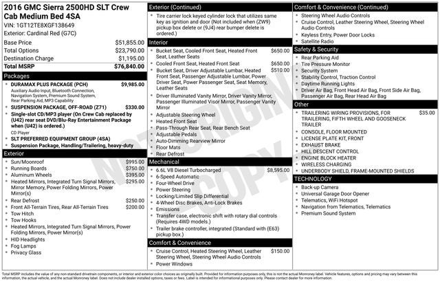 Cardinal Red 2016 GMC Sierra 2500HD SLT 4WD Allison 1000 6-Speed Automatic Duramax 6.6L V8 Turbodiesel WE DELIVER ANYWHERE, Allison 1000 6-Speed Automatic, 4WD, Cocoa/Dune Leather, Bose 6 Speaker Sound System, Duramax Plus Package, Heavy-Duty Handling/Trailering Suspension Package, Hill Descent Control, Off-Road Package, Radio: AM/FM/SiriusXM/HD w/Navigation, Trailering Equipment, Ultrasonic Front & Rear Park Assist, Z71 Badging, 110-Volt AC Power Outlet, 3.73 Rear Axle Ratio, 4-Wheel Disc Brakes, 4.2 Diagonal Color Display Driver Info Center, 6 Speakers, 6 Rectangular Chrome Tubular Assist Steps (LPO), ABS brakes, Adjustable pedals, Air Conditioning, Alloy wheels, AM/FM radio: SiriusXM, Auto-dimming door mirrors, Auto-Dimming Inside Rear-View Mirror, Auto-dimming Rear-View mirror, Automatic temperature control, Bluetooth® For Phone, Bodyside moldings, Brake assist, Bumpers: chrome, Camper & 5th Wheel Trailer Wiring Provisions, CD player, Chrome Bodyside Moldings, Chrome Door Handles, Chrome Mirror Caps, Chrome Power-Adjustable Heated Outside Mirrors, Chrome wheels, Color-Keyed Carpeting Floor Covering, Compass, Deep-Tinted Glass, Delay-off headlights, Digital Steering Assist, Driver & Front Passenger Vanity Mirror Visors, Driver door bin, Driver vanity mirror, Dual front impact airbags, Dual front side impact airbags, Dual-Zone Automatic Climate Control, Electric Rear-Window Defogger, Electronic Shift Transfer Case, Electronic Stability Control, Emergency communication system, Engine Block Heater, Exhaust Brake, Exterior Parking Camera Rear, EZ-Lift & Lower Tailgate, Floor Mounted Console, Front 40/20/40 Split Bench Seat, Front anti-roll bar, Front Center Armrest w/Storage, Front dual zone A/C, Front fog lights, Front Full Feature Bucket Seats, Front Halogen Fog Lamps, Front License Plate Kit, Front reading lights, Front wheel independent suspension, Frontal Passenger-Side Air Bag Deactivation Switch, Fully automatic headlights, Garage door transmitter, HD Radio, Heated & Vented Front Bucket Seats, Heated door mirrors, Heated Driver and Front Passenger Seats, Heated front seats, Heated Leather Wrapped Steering Wheel, Heated Power-Adjustable Outside Mirrors, High-Intensity Discharge Headlights, Illuminated entry, Leather Appointed Seat Trim, Leather-Wrapped Steering Wheel, LED Cargo Box Lighting, Low tire pressure warning, Manual Tilt-Wheel/Telescoping Steering Column, Memory seat, Occupant sensing airbag, OnStar 4G LTE Wi-Fi Hotspot, OnStar 6 Months Guidance Plan, Outside temperature display, Overhead airbag, Overhead console, Panic alarm, Passenger door bin, Passenger vanity mirror, Power door mirrors, Power driver seat, Power passenger seat, Power Sliding Rear Window w/Defogger, Power steering, Power Sunroof, Power windows, Power Windows w/Driver Express Up & Down, Power-Adjustable Pedals For Accelerator & Brake, Premium audio system: IntelliLink, Radio: AM/FM/SiriusXM/HD, Rear 60/40 Folding Bench Seat (Folds Up), Rear reading lights, Rear seat center armrest, Rear step bumper, Rear Vision Camera w/Dynamic Guide Lines, Rear Wheelhouse Liners, Rear window defroster, Remote Keyless Entry, Remote keyless entry, Remote Locking Tailgate, Remote Vehicle Starter System, Security system, Single Slot CD/MP3 Player, SiriusXM Satellite Radio, SLT Decor, Speed control, Speed-sensing steering, Split folding rear seat, Steering Wheel Audio Controls, Steering wheel mounted audio controls, Tachometer, Telescoping steering wheel, Theft Deterrent System (Unauthorized Entry), Tilt steering wheel, Traction control, Trailer Brake Controller, Trip computer, Turn signal indicator mirrors, Universal Home Remote, Variably intermittent wipers, Voltmeter, Wheels: 20 5-Spoke Forged Polished Aluminum, Wireless Charging, Allison 1000 6-Speed Automatic, 4WD, Cocoa/Dune Leather, Bose 6 Speaker Sound System, Duramax Plus Package, Heavy-Duty Handling/Trailering Suspension