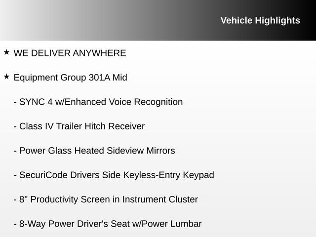 - SYNC 4 -inc: 8" LCD capacitive touchscreen w/swipe capability, wireless phone connection, cloud connected, AppLink w/App catalog, 911 Assist, Apple CarPlay and Android Auto compatibility and digital owners manual