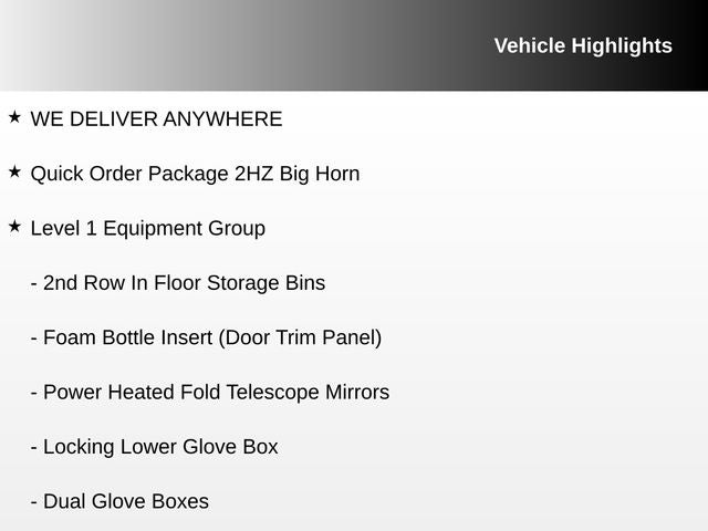 Bright White Clearcoat 2023 Ram 2500 Big Horn 4WD 6-Speed Automatic Cummins 6.7L I6 Turbodiesel WE DELIVER ANYWHERE, 2nd Row In Floor Storage Bins, 4G LTE Wi-Fi Hot Spot, 8.4 Touchscreen Display, Apple CarPlay, Auto Power-Folding Mirrors, Big Horn IP Badge, Black Exterior Mirrors, Bluetooth® Handsfree Phone & Audio, Connectivity - US/Canada, Dual Glove Boxes, Exterior Mirrors Courtesy Lamps, Exterior Mirrors w/Heating Element, Exterior Mirrors w/Supplemental Signals, Foam Bottle Insert (Door Trim Panel), Footwell Courtesy Lamp, For Details, Visit DriveUconnect.com, For More Info, Call 800-643-2112, Forward & Reverse Utility Lights, Front Fog Lamps, Global Telematics Box Module (TBM), Glove Box Lamp, Google Android Auto, GPS Antenna Input, Integrated Center Stack Radio, Integrated Voice Command w/Bluetooth®, Leather Wrapped Steering Wheel, Level 1 Equipment Group, Locking Lower Glove Box, Mirror Running Lights, Power Adjust Mirrors, Power Adjustable Convex Aux Mirrors, Power Heated Fold Telescope Mirrors, Power Telescoping Mirrors, Premium Cloth 40/20/40 Bench Seat, Quick Order Package 2HZ Big Horn, Radio: Uconnect 5 W w/8.4 Display, Rear Dome w/On/Off Switch Lamp, Selectable Tire Fill Alert, SiriusXM Radio Service, SiriusXM Satellite Radio, Steering Wheel Mounted Audio Controls, 2 Way Rear Headrest Seat, 220 Amp Alternator, 3.73 Axle Ratio, 4 Way Front Headrests, 4-Wheel Disc Brakes, 40/20/40 Split Bench Seat, 6 Speakers, ABS brakes, Active Noise Control System, Air Conditioning, Alloy wheels, Auto-dimming Rear-View mirror, Brake assist, Bumpers: chrome, Center Hub, Center Stack Storage Drawer, Chrome Flat Cab-Length Side Steps, Cloth 40/20/40 Bench Seat, Compass, Delay-off headlights, Driver door bin, Dual Alternators Rated At 440 Amps, Dual front impact airbags, Dual front side impact airbags, Electronic Stability Control, Electronically Controlled Throttle, Emergency communication system: SiriusXM Guardian, Front anti-roll bar, Front Armrest w/Cupholders, Front Center Armrest w/Storage, Front Center Seat Cushion Storage, Front License Plate Bracket, Front reading lights, Front Seat Back Map Pockets, Fully automatic headlights, Heated door mirrors, Illuminated entry, Low tire pressure warning, Manual Adjust 4-Way Driver Seat, Manual Adjust 4-Way Front Passenger Seat, Manufacturer's Statement of Origin, Occupant sensing airbag, Outside temperature display, Overhead airbag, Overhead console, Panic alarm, ParkView Rear Back-Up Camera, Passenger door bin, Passenger vanity mirror, Power 2-Way Driver Lumbar Adjust, Power Adjust 8-Way Driver Seat, Power door mirrors, Power steering, Power windows, Radio data system, Radio: Uconnect 3 w/5 Display, Rear 60/40 Folding Seat, Rear anti-roll bar, Rear Folding Seat, Rear seat center armrest, Rear step bumper, Remote keyless entry, Speed control, Storage Tray, Tachometer, Tilt steering wheel, Tip Start, Tow Hooks, Traction control, Trip computer, Turn signal indicator mirrors, Variably intermittent wipers, Voltmeter, Wheels: 18 x 8.0 Polished Aluminum, 2nd Row In Floor Storage Bins, 4G LTE Wi-Fi Hot Spot, 8.4 Touchscreen Display, Apple CarPlay, Auto Power-Folding Mirrors, Big Horn IP Badge, Black Exterior Mirrors, Bluetooth® Handsfree Phone & Audio, Connectivity - US/Canada, Dual Glove Boxes, Exterior Mirrors Courtesy Lamps, Exterior Mirrors w/Heating Element, Exterior Mirrors w/Supplemental Signals, Foam Bottle Insert (Door Trim Panel), Footwell Courtesy Lamp, For Details, Visit DriveUconnect.com, For More Info, Call 800-643-2112, Forward & Reverse Utility Lights, Front Fog Lamps, Global Telematics Box Module (TBM), Glove Box Lamp, Google Android Auto, GPS Antenna Input, Integrated Center Stack Radio, Integrated Voice Command w/Bluetooth®, Leather Wrapped Steering Wheel, Level 1 Equipment Group, Locking Lower Glove Box, Mirror Running Lights, Power Adjust Mirrors, Power Adjustable Convex Aux Mirrors, Power Heated Fold Telescope Mirrors, Po